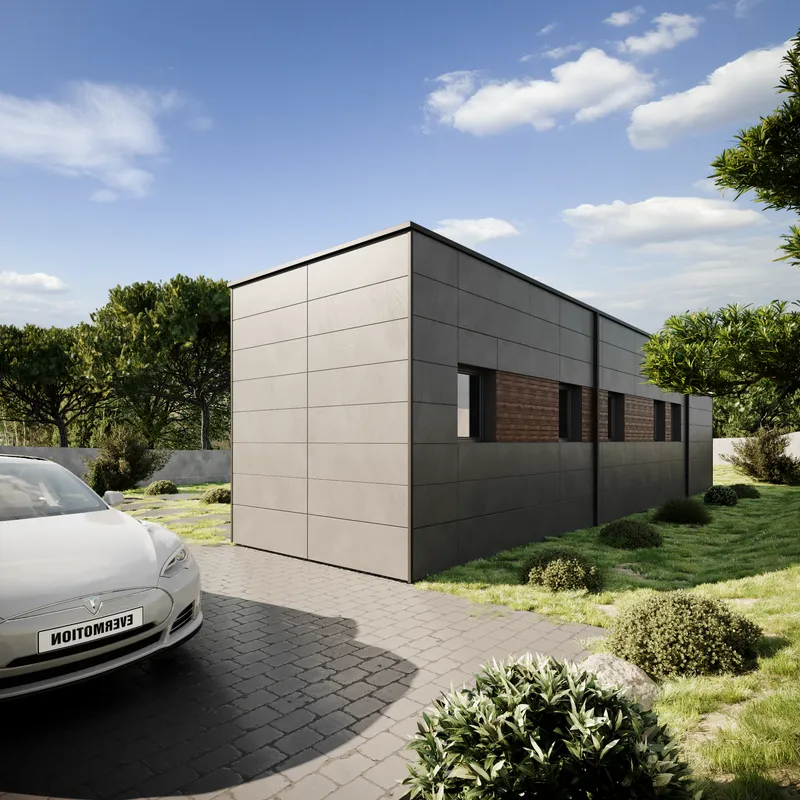 • Façana ventilada amb opció d’acabat en plaques de fibrociment de la marca NICHIHA, fusta termo tractada o xapa grecada. A més, és possible combinar diferents materials per aconseguir un disseny personalitzat i únic. (color per definir)