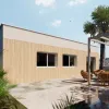 Fachada con tablas de madera color claro.