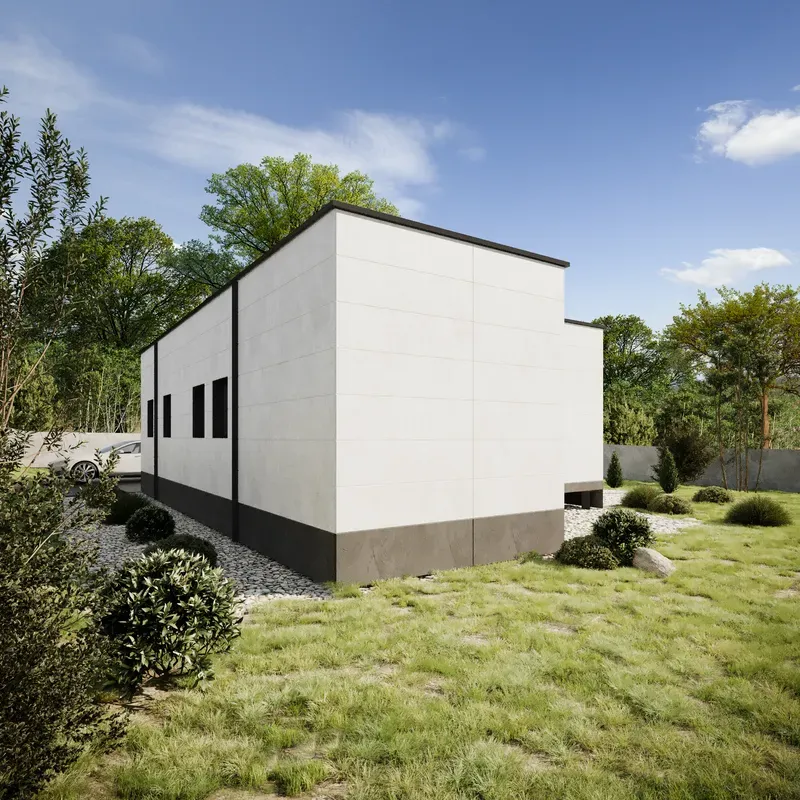 - Fachada ventilada con opción de acabado en placas de fibrocemento de la marca NICHIHA, madera termo tratada o chapa grecada. Además, es posible combinar diferentes materiales para lograr un diseño personalizado y único. (color por definir)